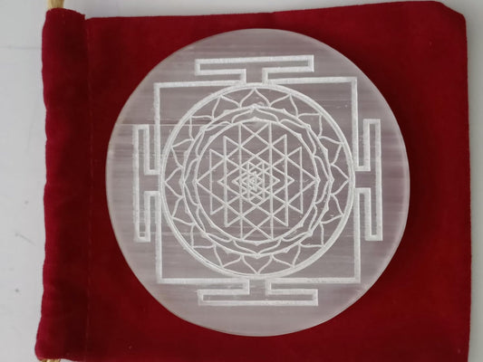 Selenite Plate Engraved Shri Yantra Used for Charging Crystal Cleansing Re-Energy Work, Meditation and Pooja -3 to 4 inch Sri Yantra (Round)